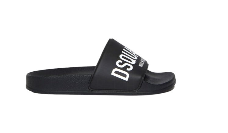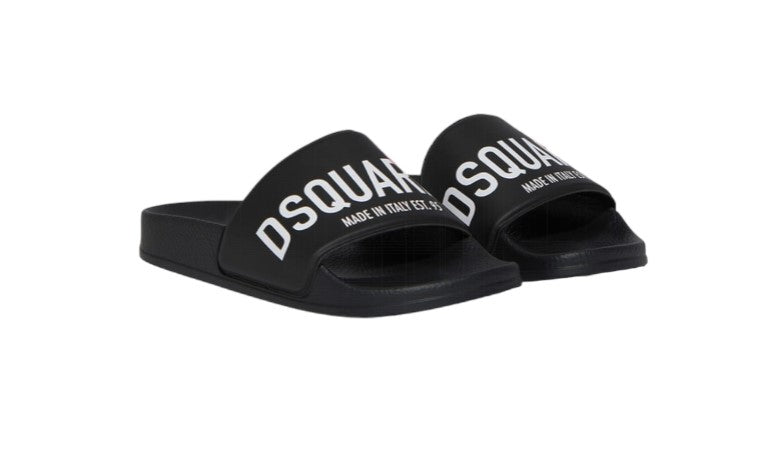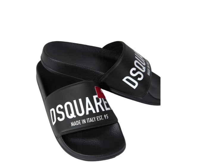 Dsquared2-Hausschuhe mit roter Schrift und Details.