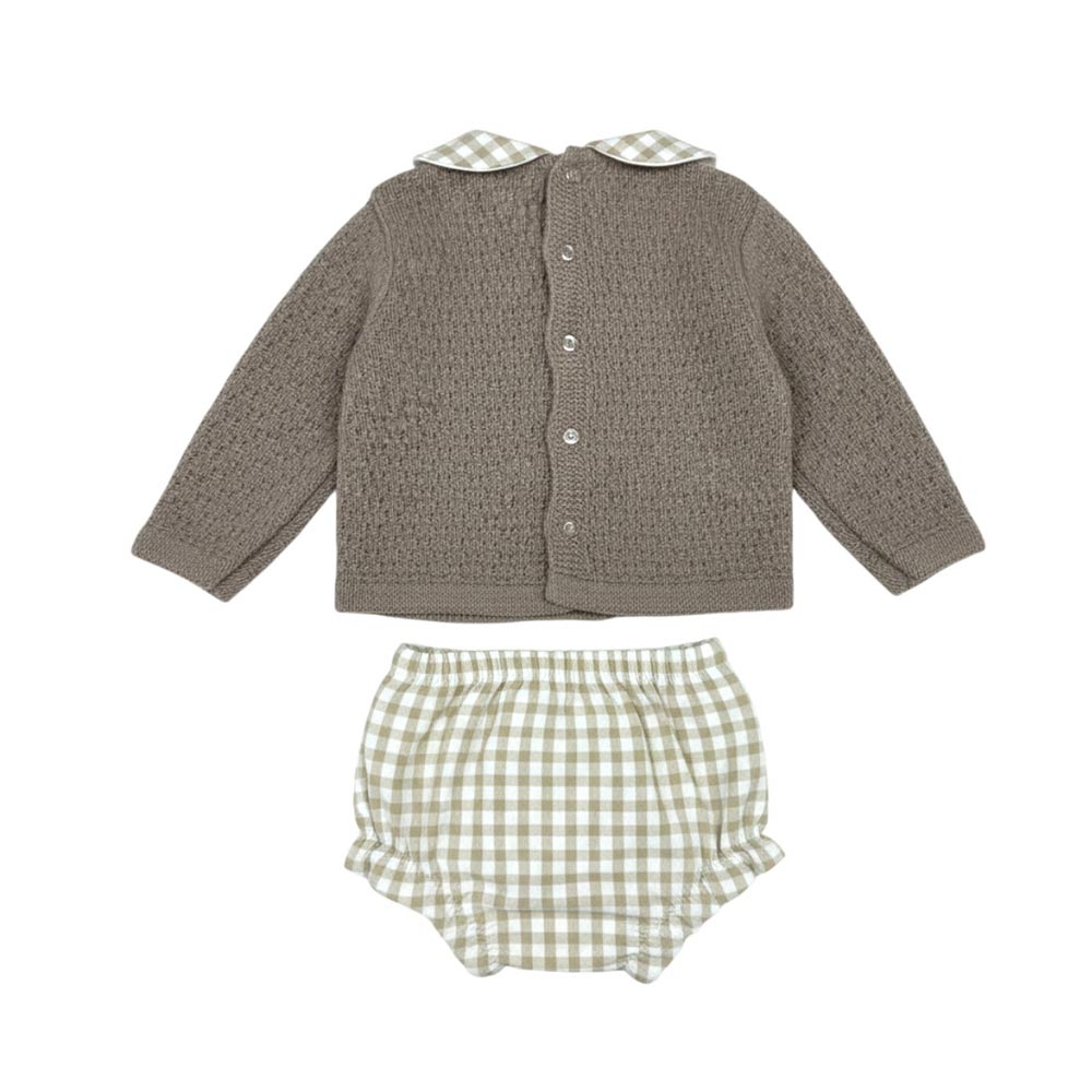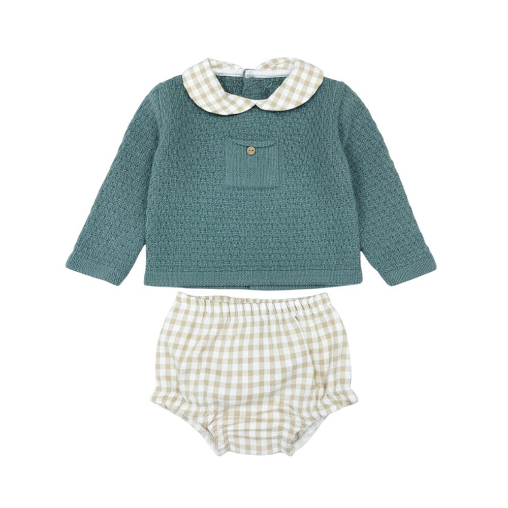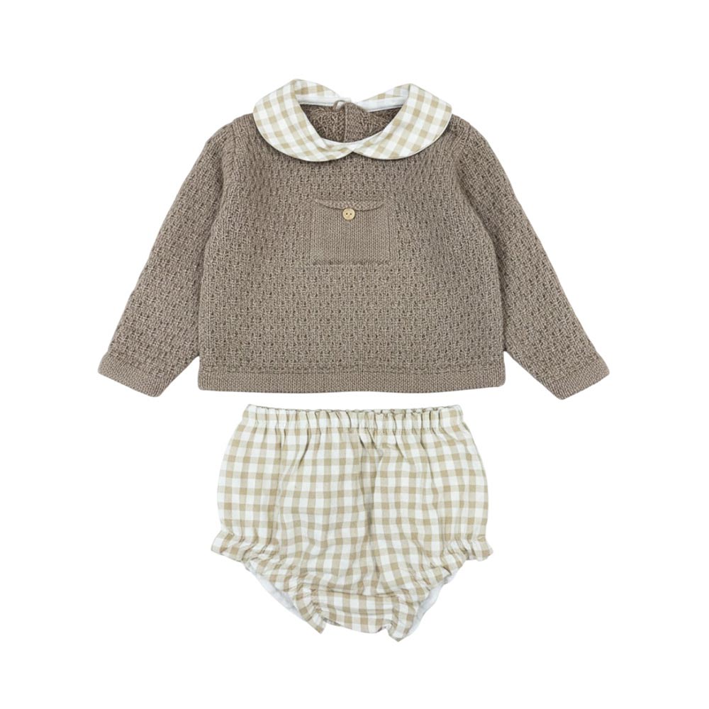 Maglia con colletto tondo e taschina sul davanti abbinato al pantaloncino a culotte di tessuto a quadretti