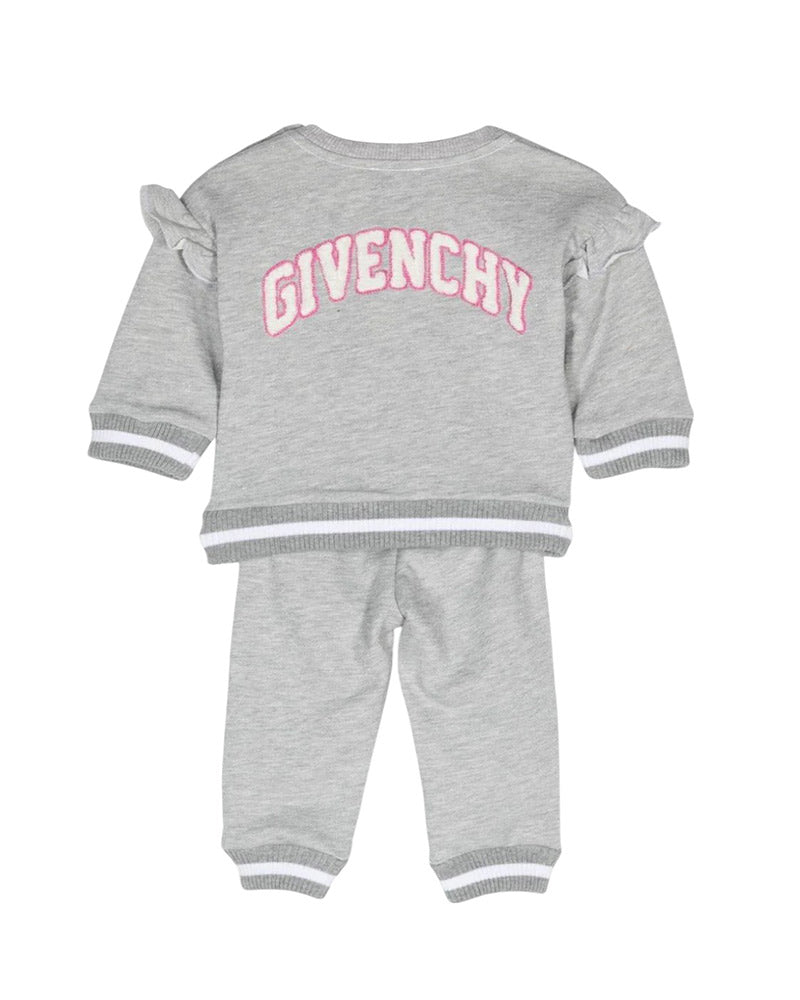 Completo da neonata realizzato in felpa di cotone sgarzato. Composto da felpa girocollo a maniche lunghe con rouches, chiusura con bottoncini a pressione sulla spalla, è decorata con logo ricamato e patch logo sul davanti e sul retro. Pantaloni jogger con elastico in vita e coulisse, tasche laterali, logo ricamato e fondo con elastico all caviglia.