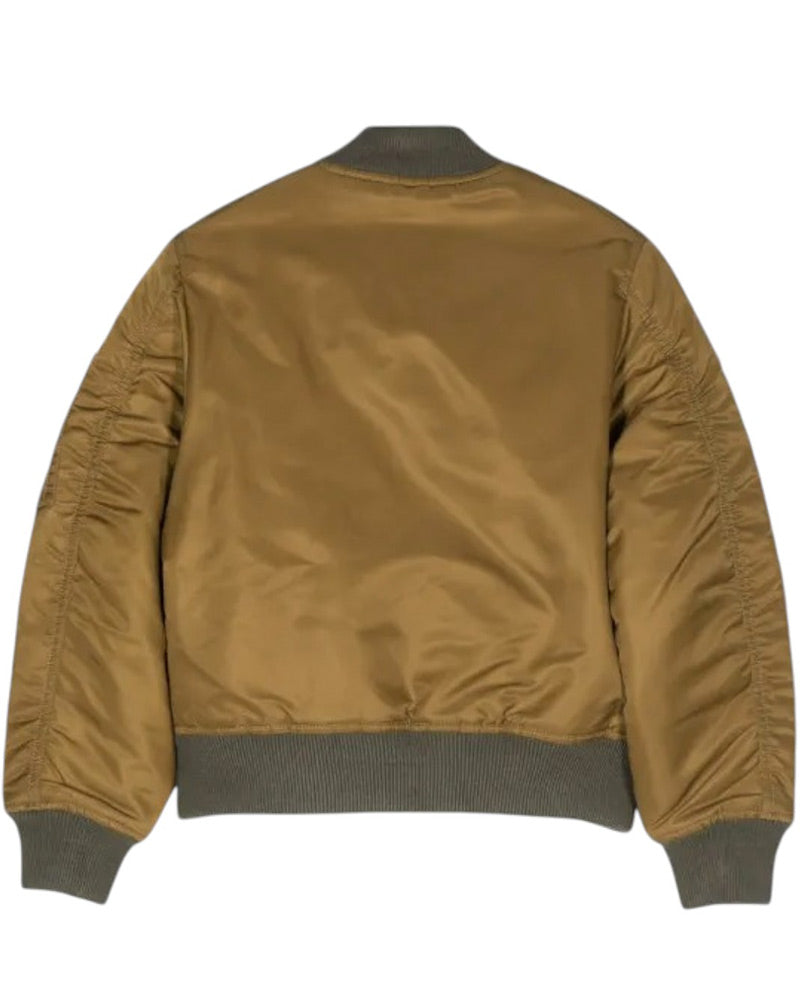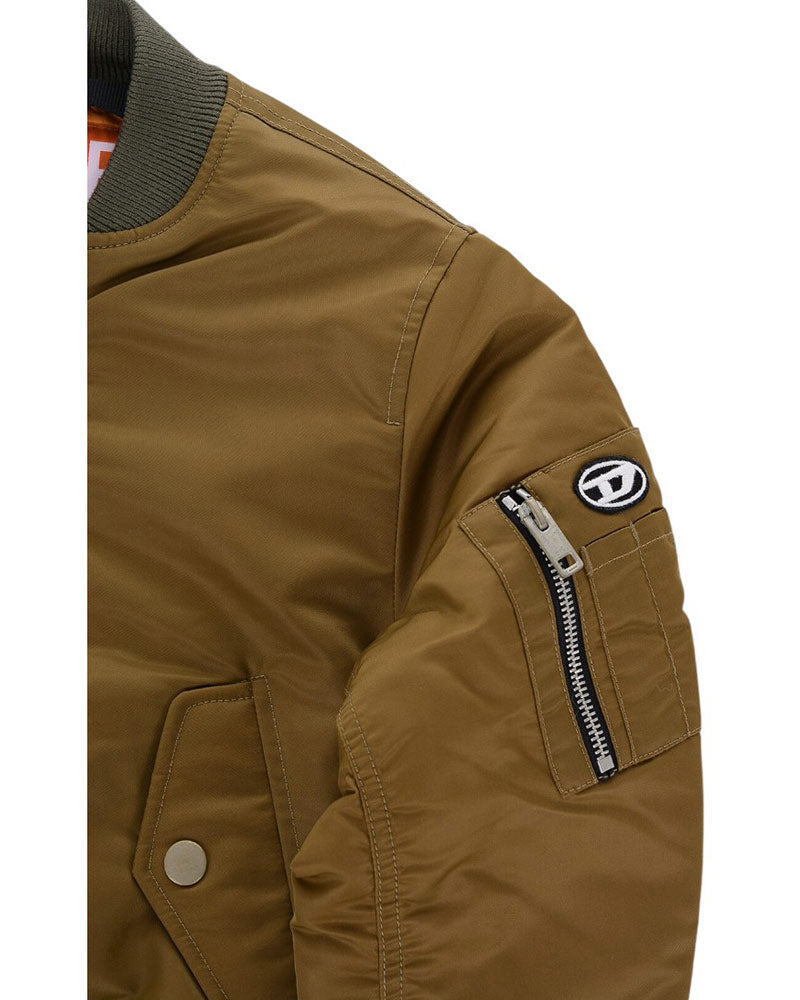 Wattierte Bomberjacke mit geripptem Kragen. Es verfügt über einen Reißverschluss vorne, zwei Seitentaschen mit Patte, eine Reißverschlusstasche am Ärmel mit aufgesetztem Logo-Patch und gerippte Bündchen.