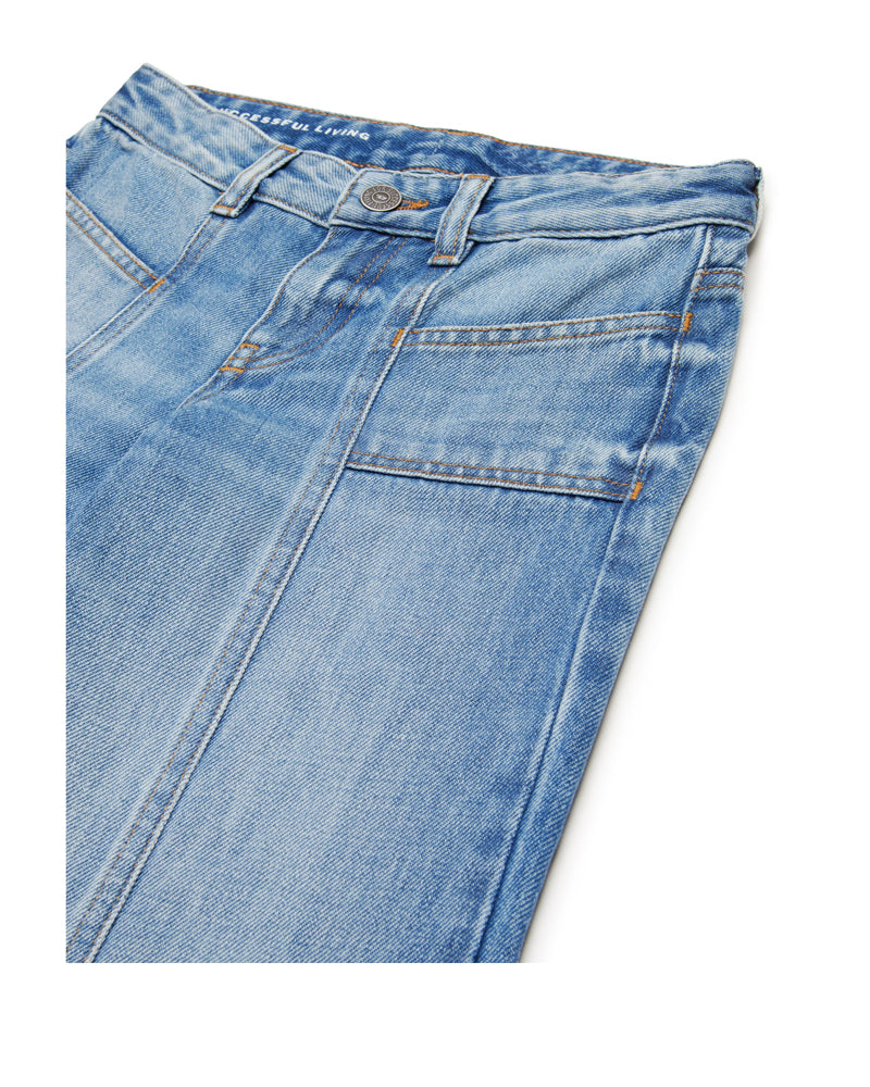 Jeans flare fit da bambina realizzati in denim di cotone, modello cinque tasche. Presentano vita media, chiusura frontale con bottone e zip, vita regolabile grazie ad elastico interno con bottoni, cuciture stile pince lungo le gambe. Sono decorati con patch logo applicata sul davanti e label sul retro.