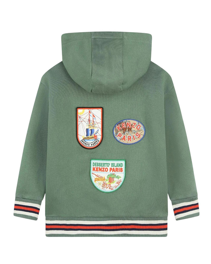 Felpa verde da bambino realizzata in cotone garzato. Presenta cappuccio, maniche lunghe, fodera in pile, tasca a marsupio sul davanti, polsi e orlo a coste. È decorata con multi patch sul davanti e sul retro.