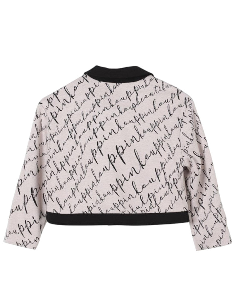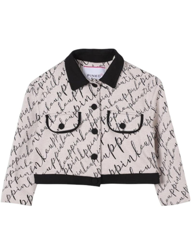 Giacca monopetto beige da bambina, realizzata in maglia di misto viscosa. Presenta colletto classico a contrasto, chiusura frontale con bottoni, maniche lunghe, due tasche con patta applicate sul petto, taglio cropped e orlo dritto. È decorata con fantasia logo jacquard all-over.