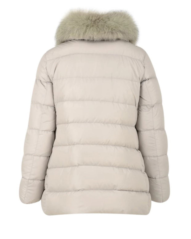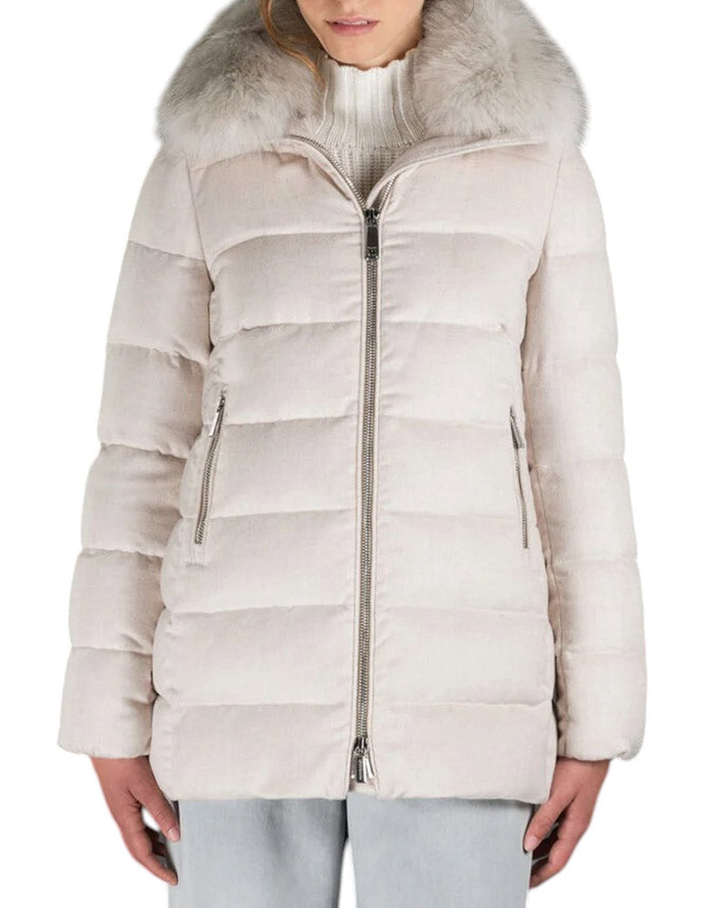 Giubbino dalla raffinata linea a trapezio, imbottito in finissima piuma d’oca e trapuntato a boudin. Collo impreziosito da bordo staccabile in pelliccia di volpe. Chiusura frontale con maxi zip con doppio cursore. Tasche a filetto verticali chiuse da zip ai fianchi.
