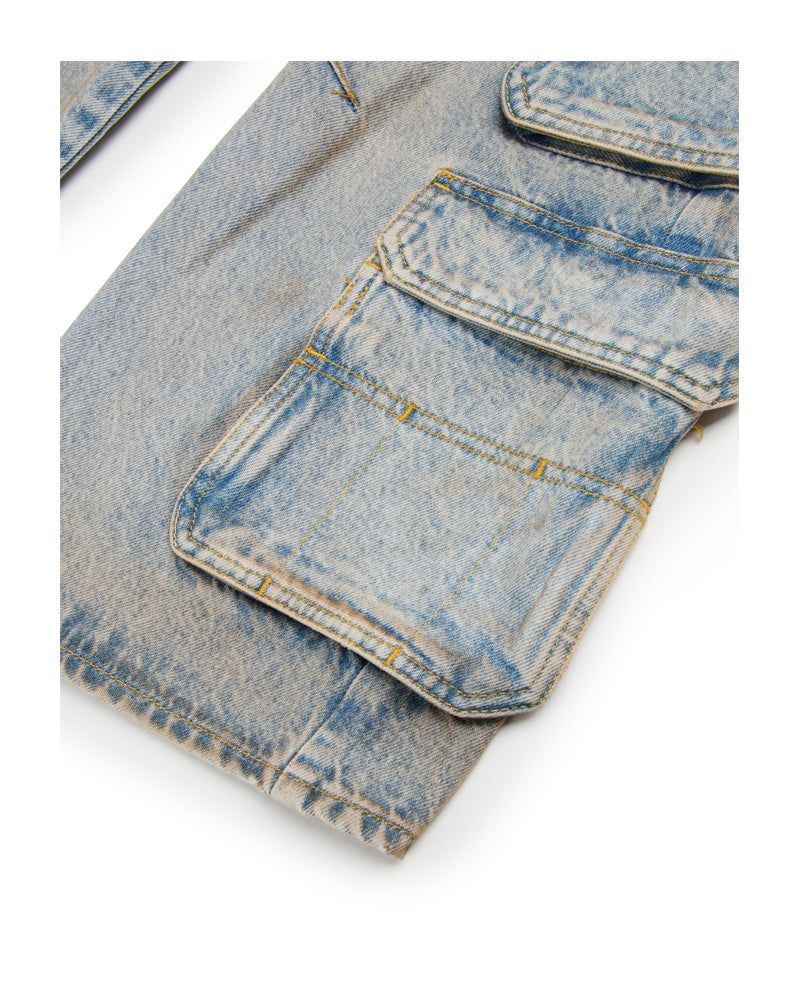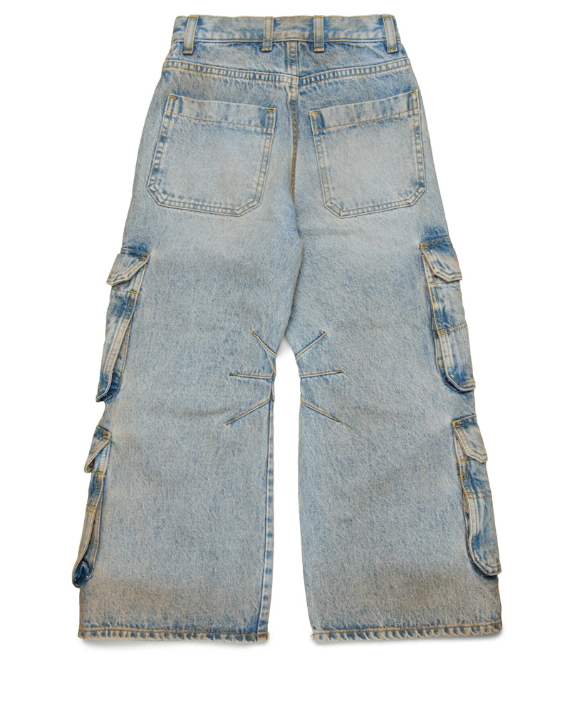 Jeans a cinque tasche dal fit straight e attitude street. A vita bassa. Realizzato in denim blu chiaro effetto dusty, contraddistinto da sfumature, baffature e cuciture a contrasto cromatico. Tasche stile cargo applicate lungo le gambe. Chiusura frontale con bottone e zip, vita regolabile grazie ad elastico interno con bottoni e label logo applicata sul retro.