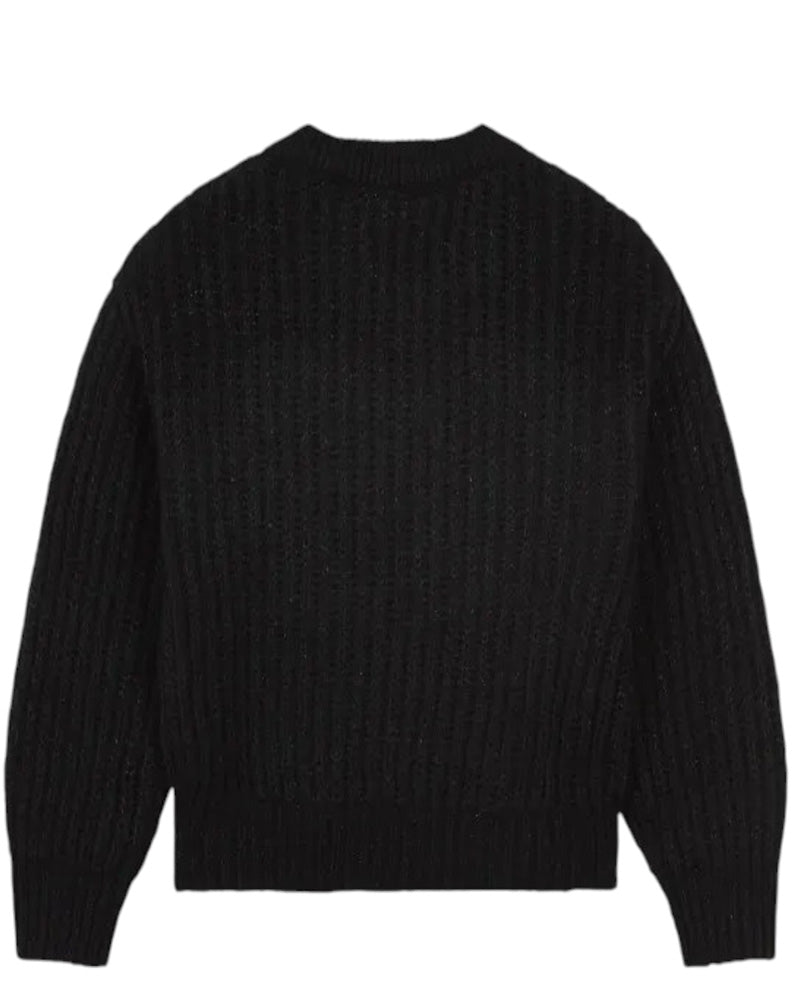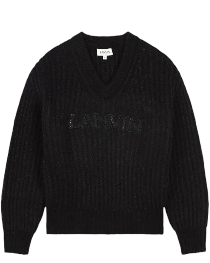 Maglia nera da bambina realizzata in misto lana con dettagli lurex. Presenta scollo a V, maniche lunghe e finiture a coste. È decorata con applicazione patch logo sulla parte anteriore.