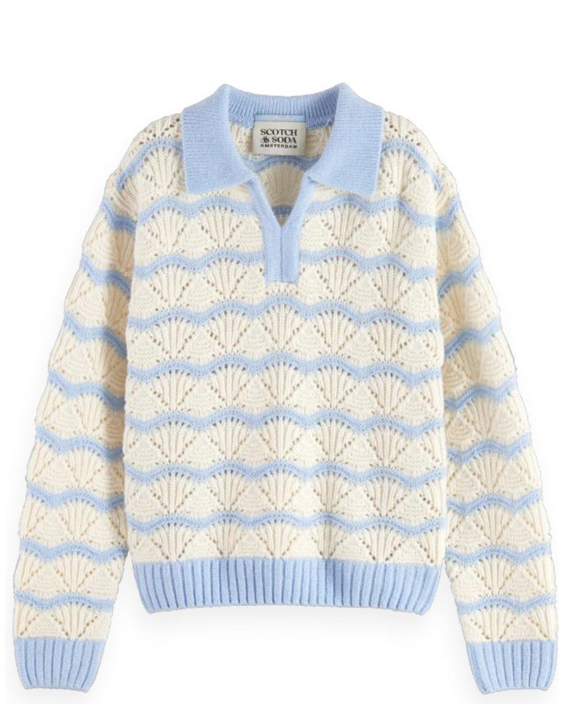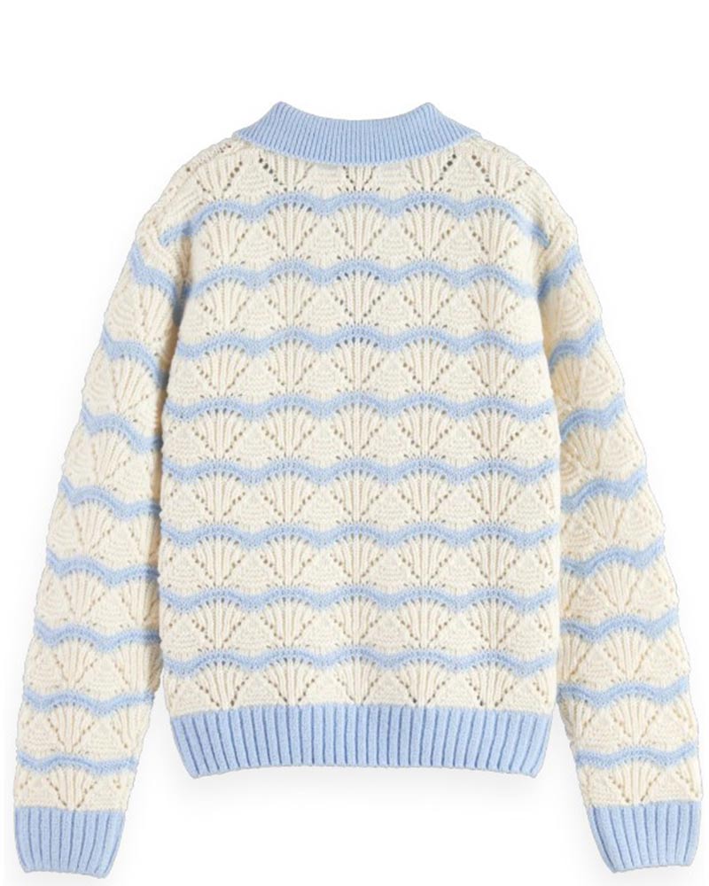 Maglia a polo in pointelle a righe da bambina. Presenta scollo a V, maniche lunghe e finiture a coste.