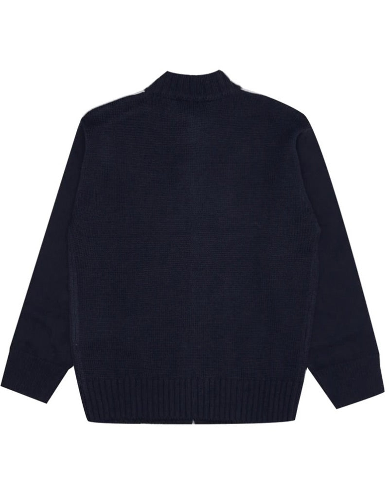 Cardigan blu navy da bambino, realizzato in misto lana. Presenta colletto alto, chiusura frontale con zip, maniche lunghe e finiture a coste. È decorato con logo jacquard sulle maniche.
