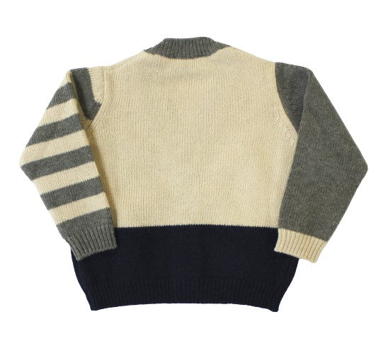 Strickjacke aus Wolle mit farbigen Einsätzen und Knöpfen zum Schließen.