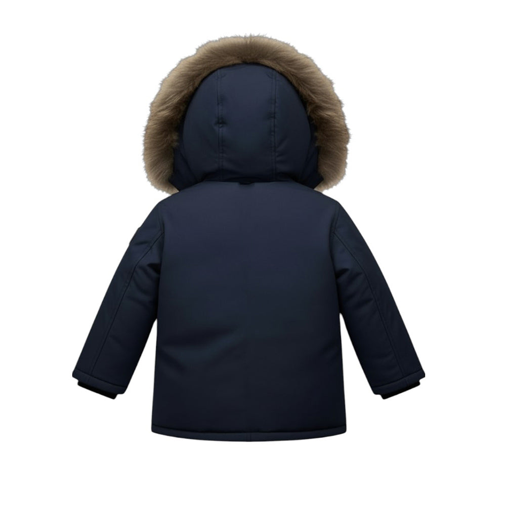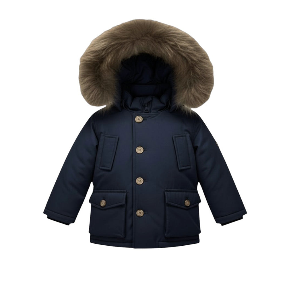 Der Arctic Parka für Neugeborene aus Ramar Cloth-Stoff. Es verfügt über eine feste Kapuze mit abnehmbarem Fell, eine Wattierung aus Entendaunen, einen Reißverschluss und Knopfverschluss vorne, zwei Seitentaschen mit Patte und zwei Handwärmtaschen auf der Vorderseite.