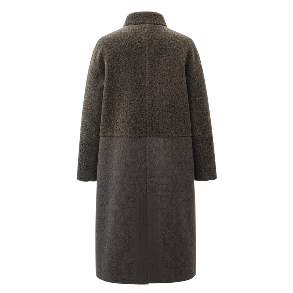 Cappotto monopetto da donna realizzato in 100% vero shearling. Presenta collo rotondo, chiusura frontale nascosta con bottoni a pressione, maniche lunghe, due tasche laterali a filetto e orlo dritto. È decorato con dettagli in monile intorno al collo.