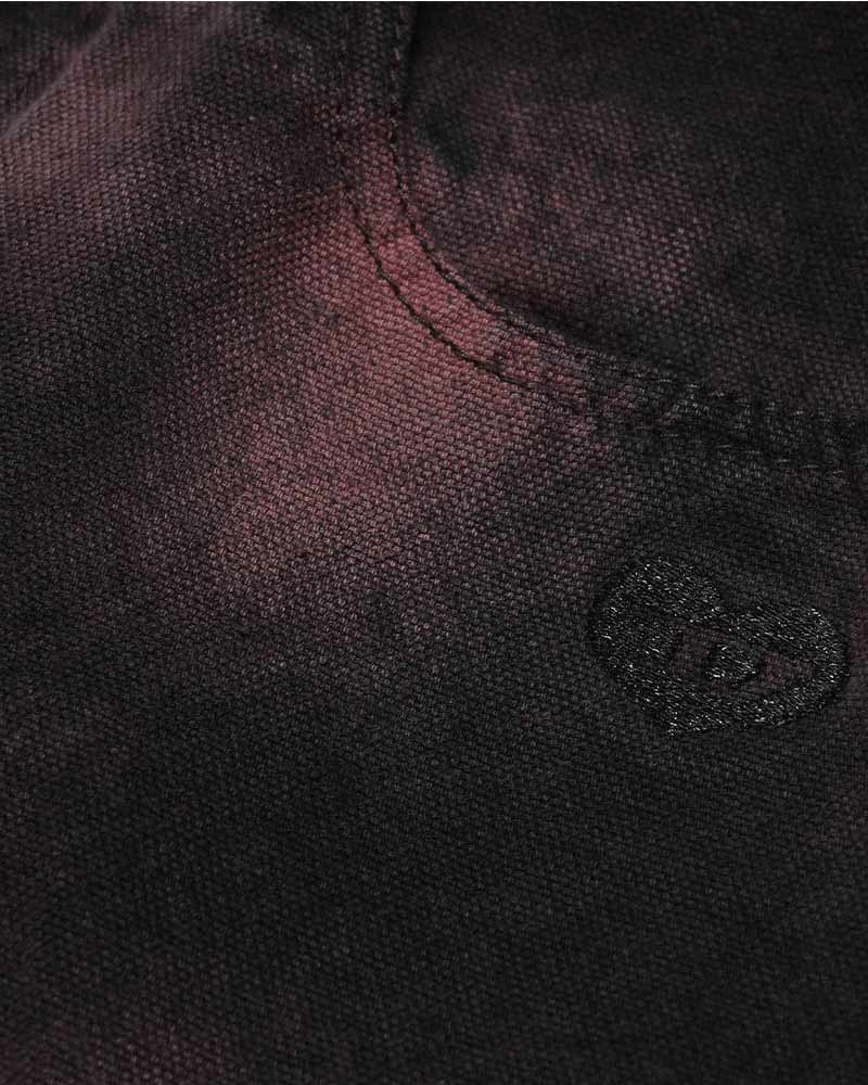 Pantaloni realizzati in denim di cotone effetto tie-dye, modello cinque tasche. Presentano chiusura frontale con bottone e zip, vita regolabile grazie ad elastico interno con bottoni, gamba larga. Sono decorati con patch logo effetto glitter applicata sul davanti.