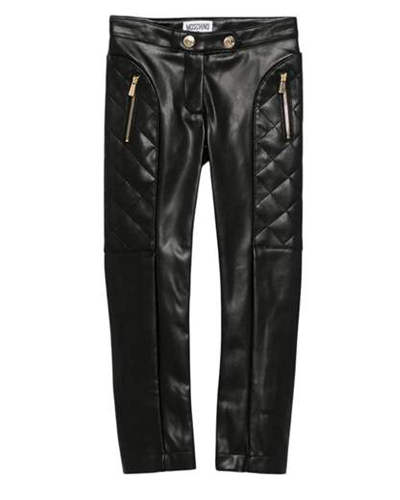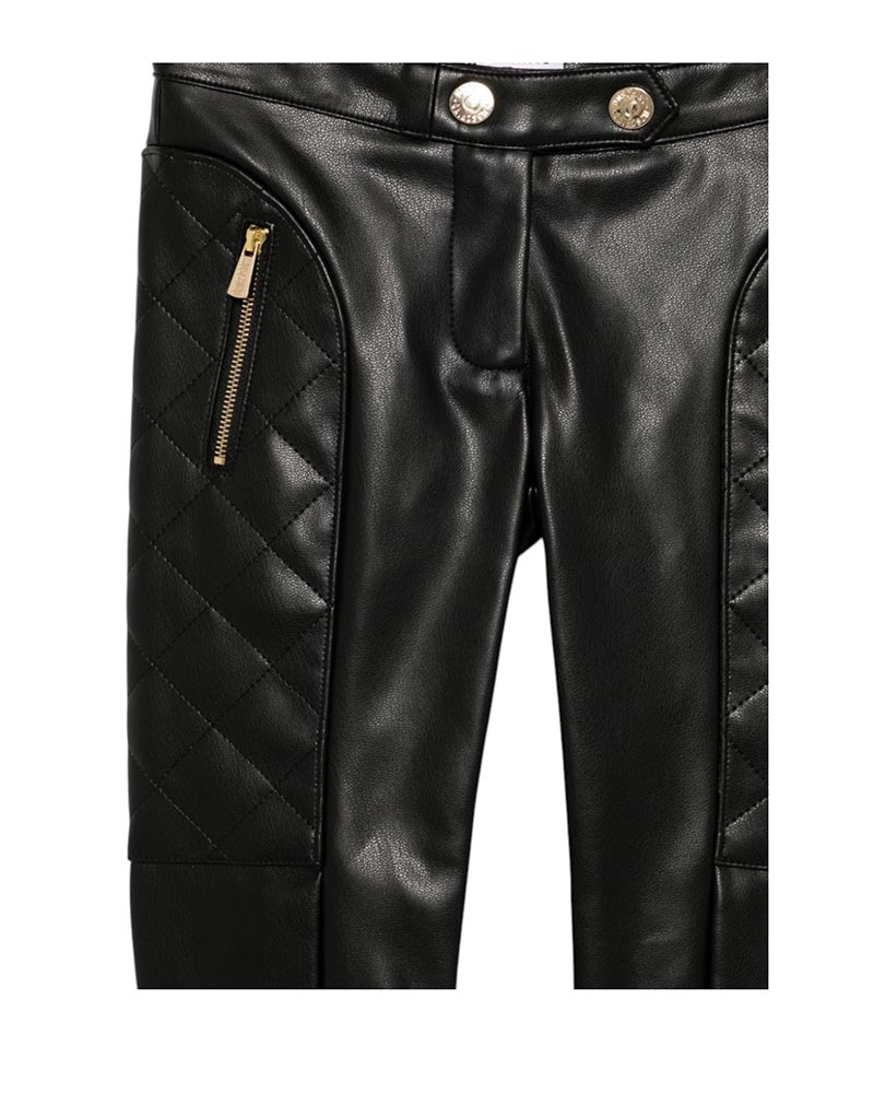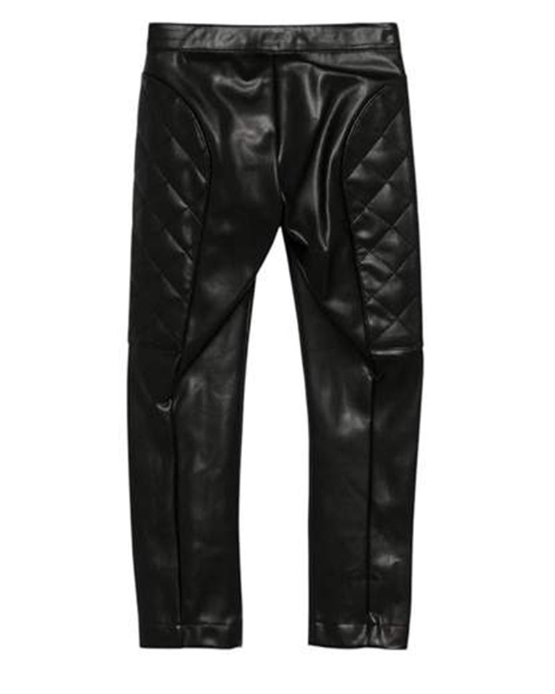 Pantaloni realizzati in similpelle da bambina. Presentano chiusura frontale con bottoni automatici e zip, vita regolabile grazie ad elastico interno con bottoni, tasche laterali con cerniera, fodera integrale in pile, taglio slim.