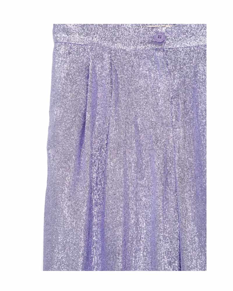 Pantaloni con finitura metallizzata da bambina. Presentano chiusura frontale con bottone e zip, pinces, vita regolabile grazie ad elastico interno con bottoni, tasche laterali.