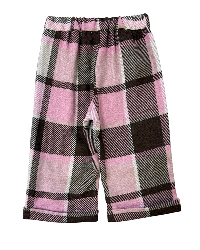Pantaloni realizzati in misto lana da bambina. Presentano vita elasticizzata sul retro, gamba larga con risvolto al fondo e fantasia tartan all-over.