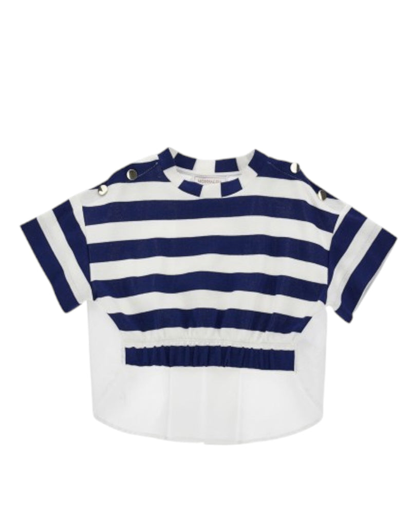 T-shirt girocollo in jersey di cotone, manica corta, in fantasia rigata, bottoni sulle spalle in metallo argento.