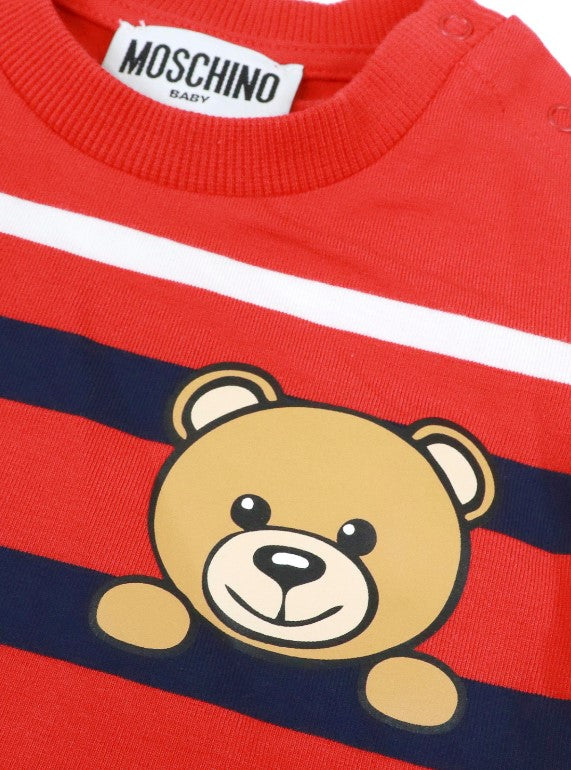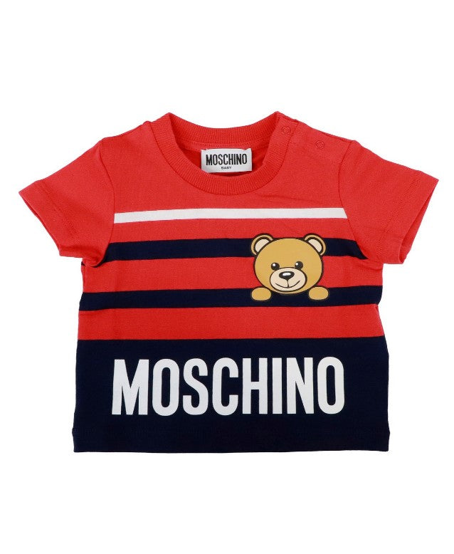 Kurzärmliges T-Shirt mit Rundhalsausschnitt und Teddybär-Aufdruck auf der Vorderseite. Verschlussclips an der Schulter.