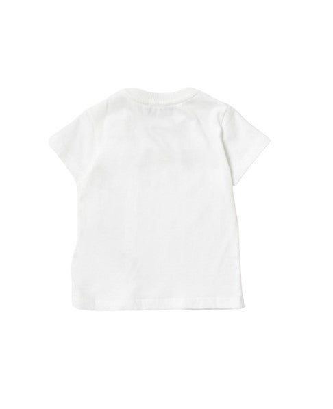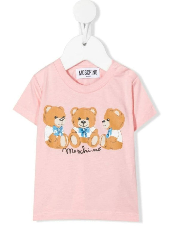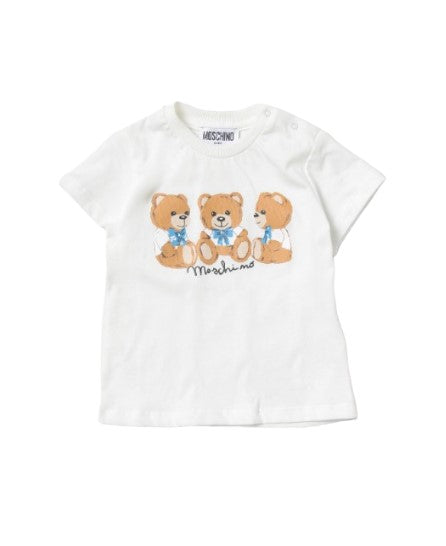 Kurzärmliges T-Shirt mit Rundhalsausschnitt und Teddybär-Aufdruck auf der Vorderseite. Verschlussclips an der Schulter.