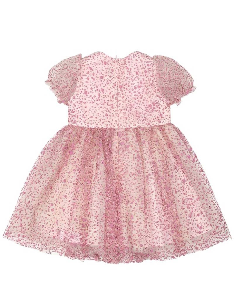 Vestina da neonata in tulle con dettagli glitter. Presenta colletto tondo, maniche corte, fodera integrale, chiusura sul retro con zip e gonna a balze.