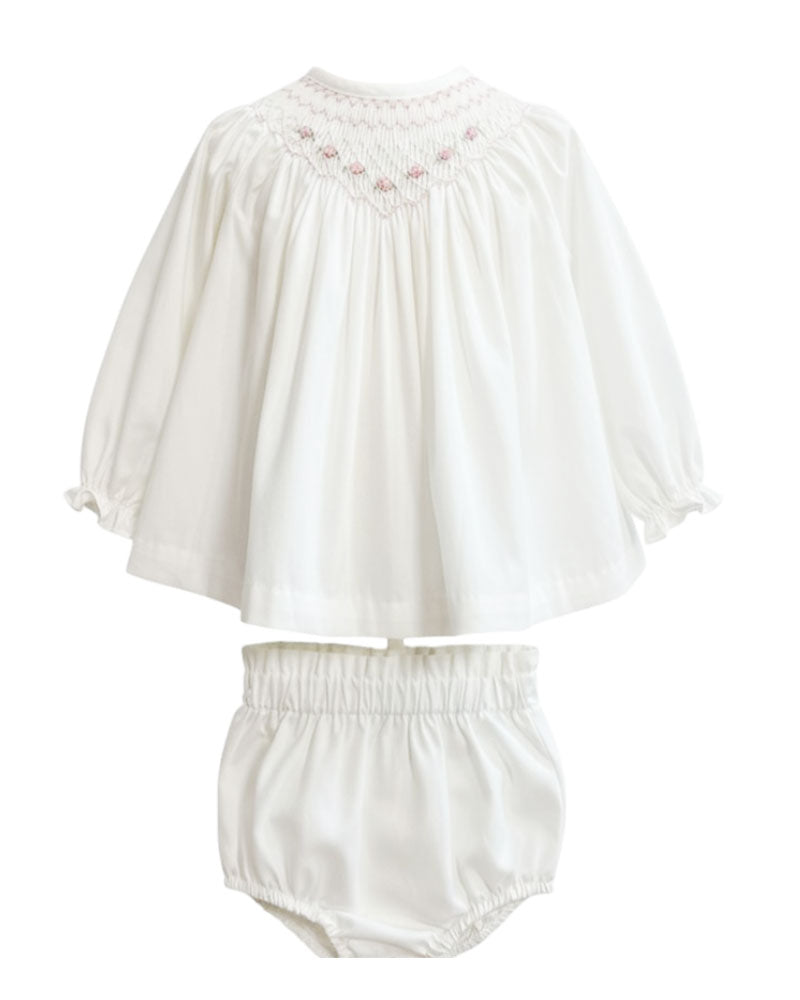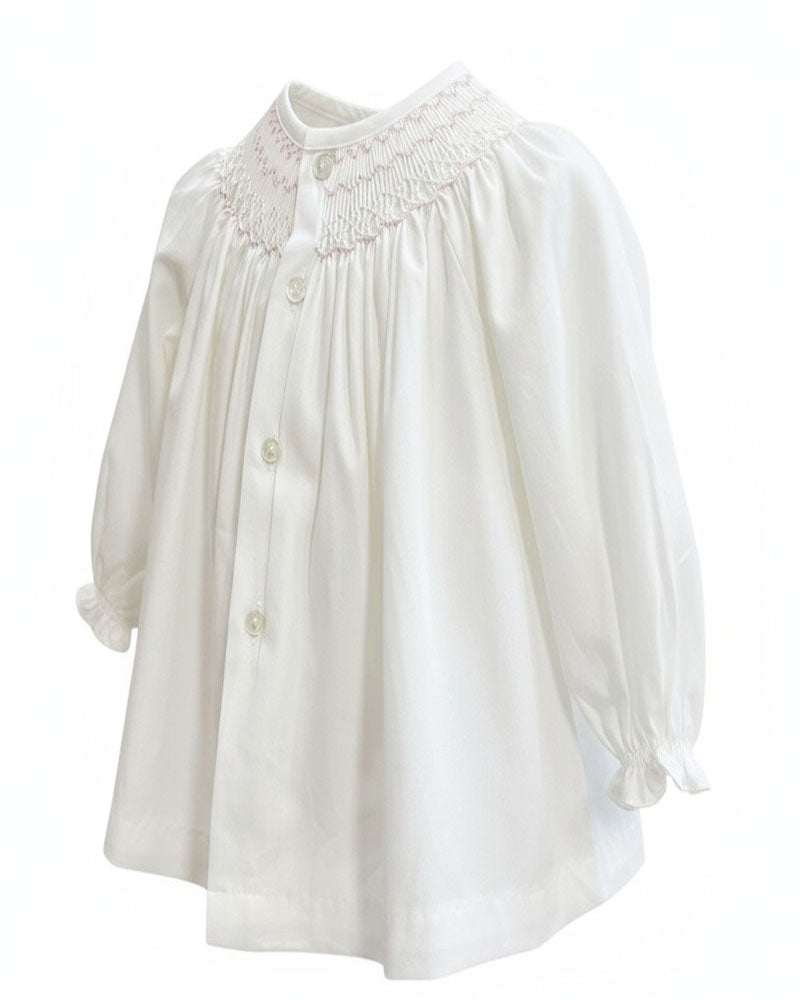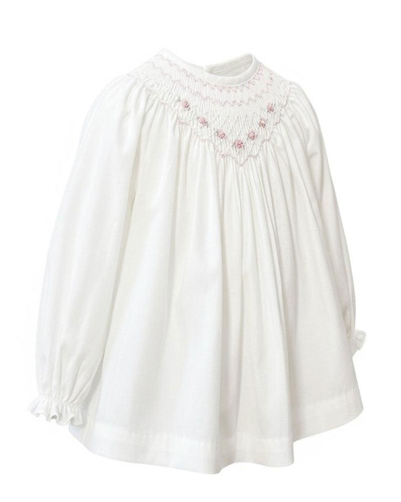 Presenta una lavorazione a smock sul corpetto ricami floreali rosa. il colletto arrotondato è rifinito con un sottile bordo rosa.