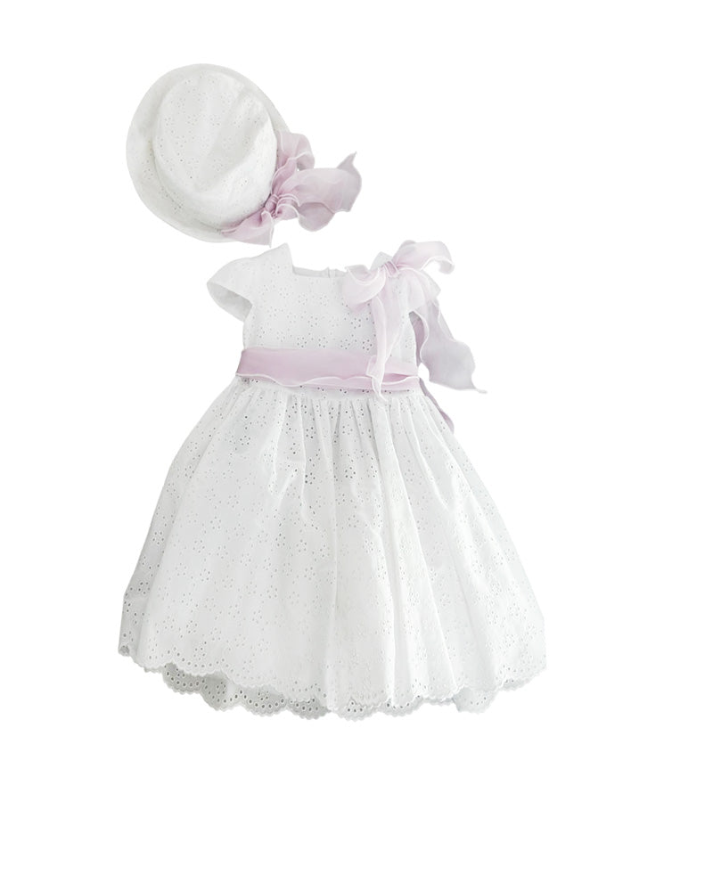 Unisce eleganza e audacia con la Vestina Cerimonia ve7424 In Sangallo di Teto e Tatta! La manica ad aletta, il fiocco e la cintura in organza creano un look unico e il cappello abbinato completa il tutto. Risalta il colore a contrasto e preparati a stupire tutti!