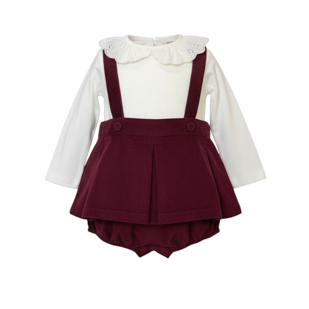 Vestina a salopette in velluto con culotte inserita, bretelle e vita elasticizzata. Body realizzato in jersey di cotone, con colletto in pizzo di sangallo, maniche lunghe e chiusura con bottoncini sulla parte posteriore.
