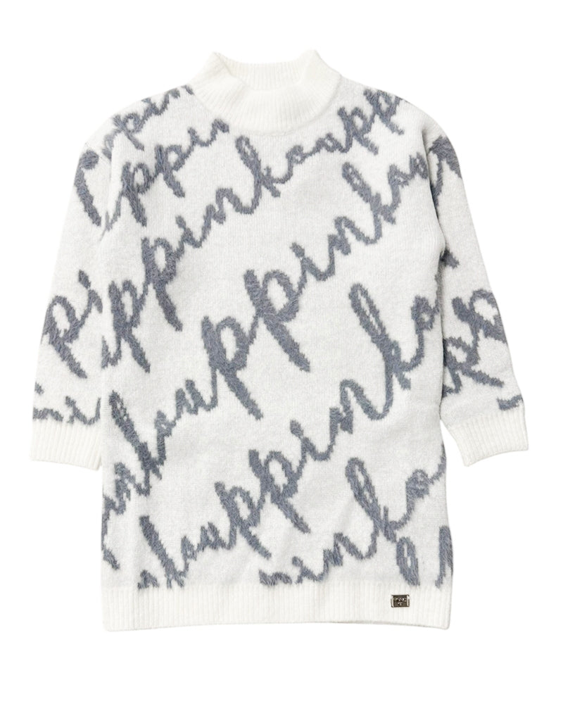 Vestina bianca da neonata realizzata in morbida maglia con effetto spazzolato. Presenta collo alto, maniche lunghe, orlo dritto e finiture a coste. È decorata con fantasia logo jacquard all-over.