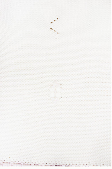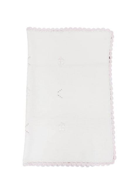 Kleine Bärendecke mit rosa Rand und gestickten Blumen.