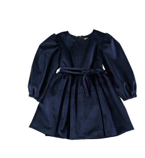 Samtkleid, lange Ärmel, Raffung an der Schulter, Gürtel in der Taille.