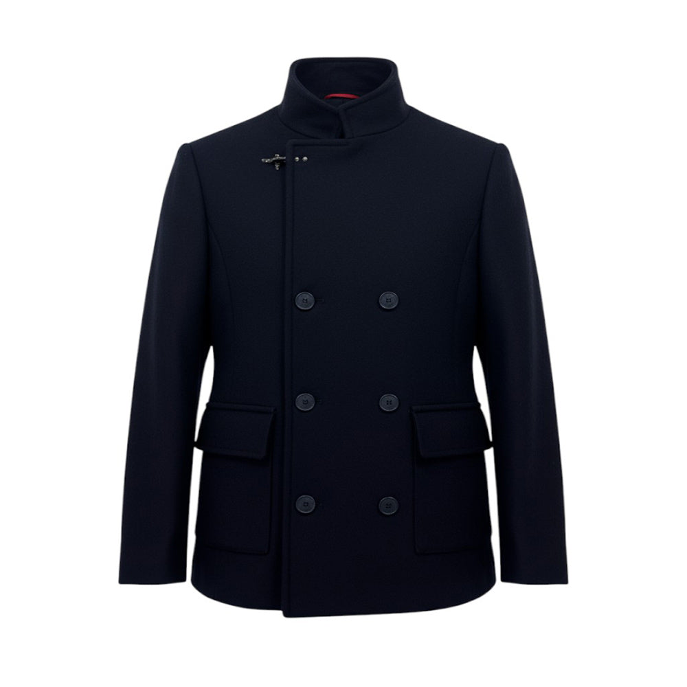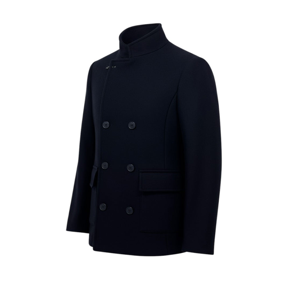 Zweireihiger Mantel, Knopf- und Hakenverschluss, aufgesetzte Taschen.