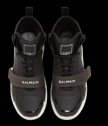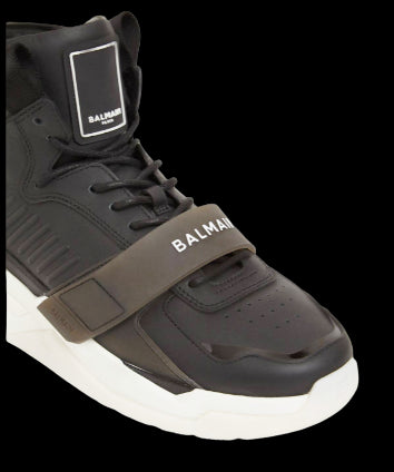 Balmain-Sneaker aus schwarzem Leder mit weißem Gummi.