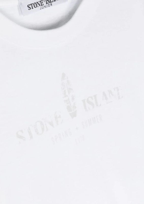 Baby-T-Shirt mit Rundhalsausschnitt, kurzen Ärmeln, Logo-Aufdruck auf der Vorderseite und Symbol-Aufdruck auf der Rückseite.
