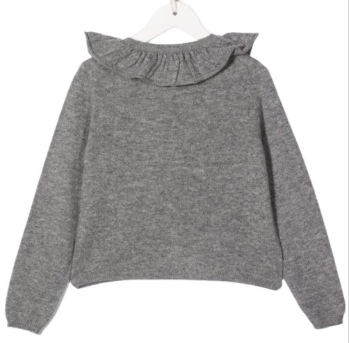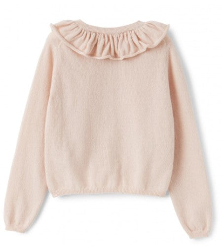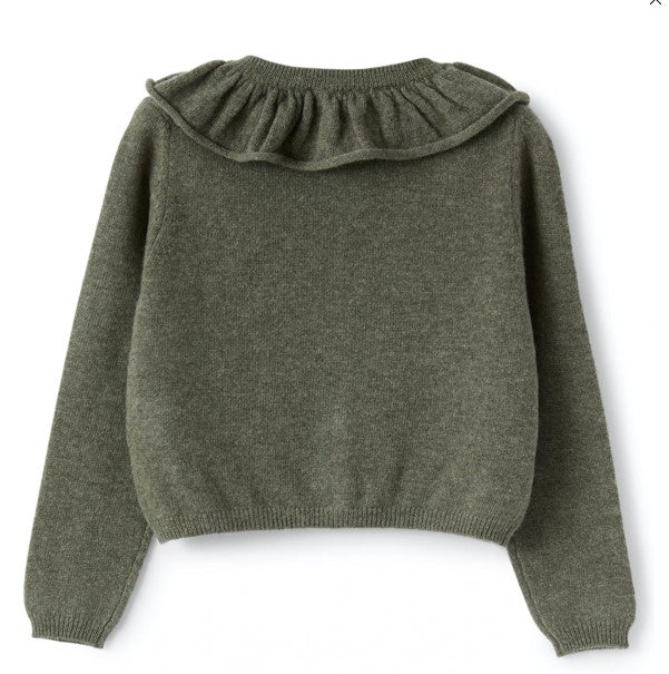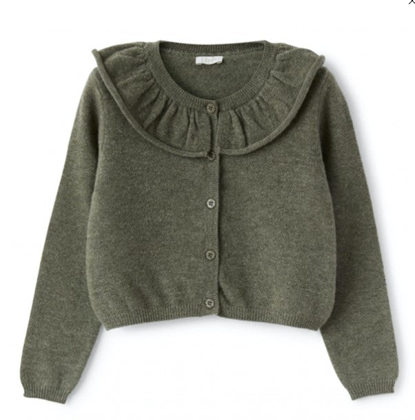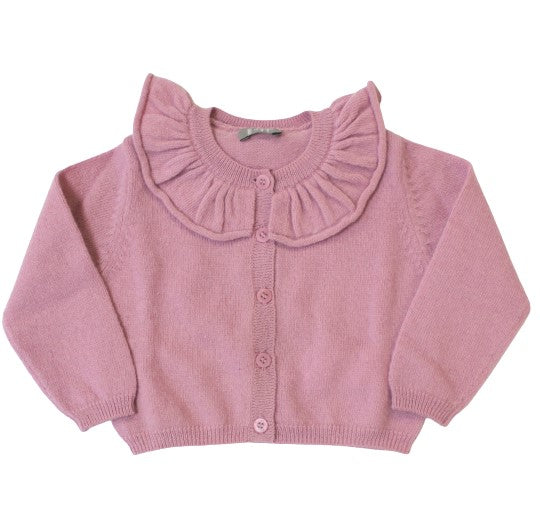 Strickjacke mit Knopfverschluss vorne und Rüschen am Hals.