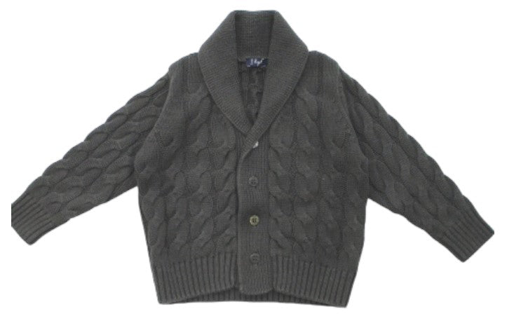 Strickjacke aus Wolle, Zopfmuster, mit Schalkragen, mit farbigen Einsätzen, kleinen Knöpfen.