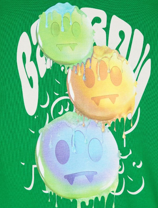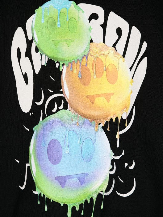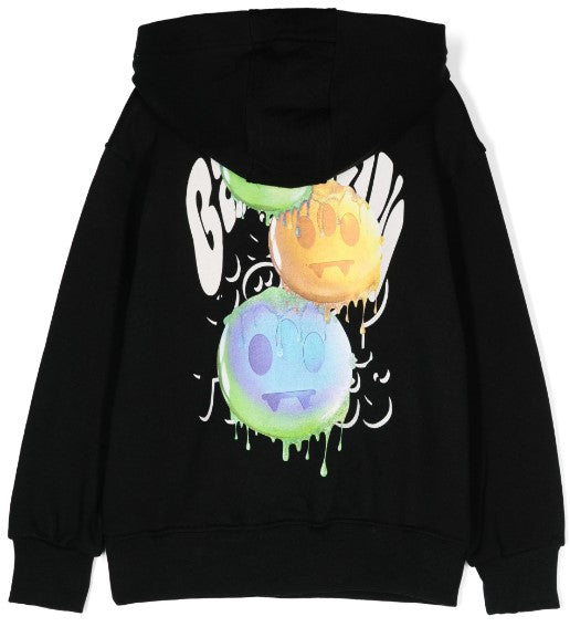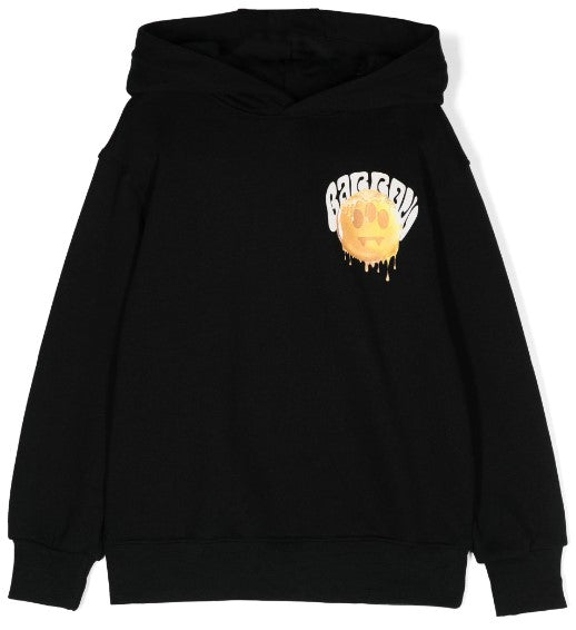 Kapuzenpullover aus Fleece-Baumwolle, mit langen Ärmeln, Smiley-Aufdruck auf der Brust und Aufdruck auf dem Rücken, geripptem Saum und Bündchen.