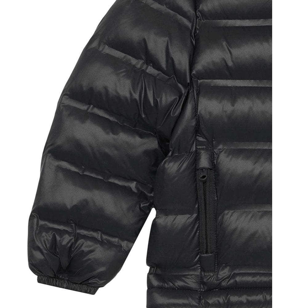 Giubbino Donald Junior realizzato in nylon lucido, caratterizzato da design trapuntato a righe, imbottito con ovatta Sorona® Aura, cappuccio fisso con coulisse (Tg. 8-16 anni), chiusura frontale con zip, maniche lunghe, foderato in nylon a contrasto, due tasche laterali con zip e coulisse sul fondo. È decorato con patch e passante con logo.