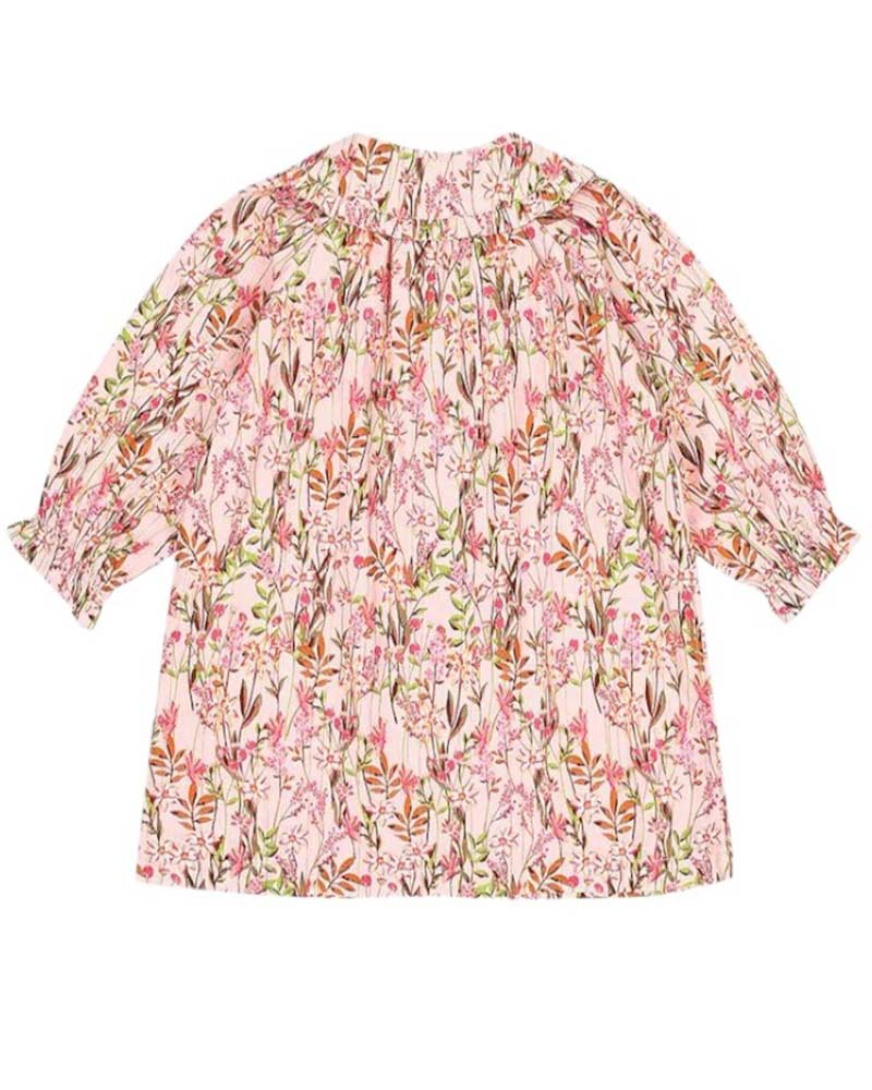 Vestina rosa da neonata realizzata in cotone. Presenta fantasia a fiori con dettagli lurex all-over, colletto Peter Pan con rouches, maniche lunghe con polsini elasticizzati, chiusura frontale con bottoncini a pressione.
