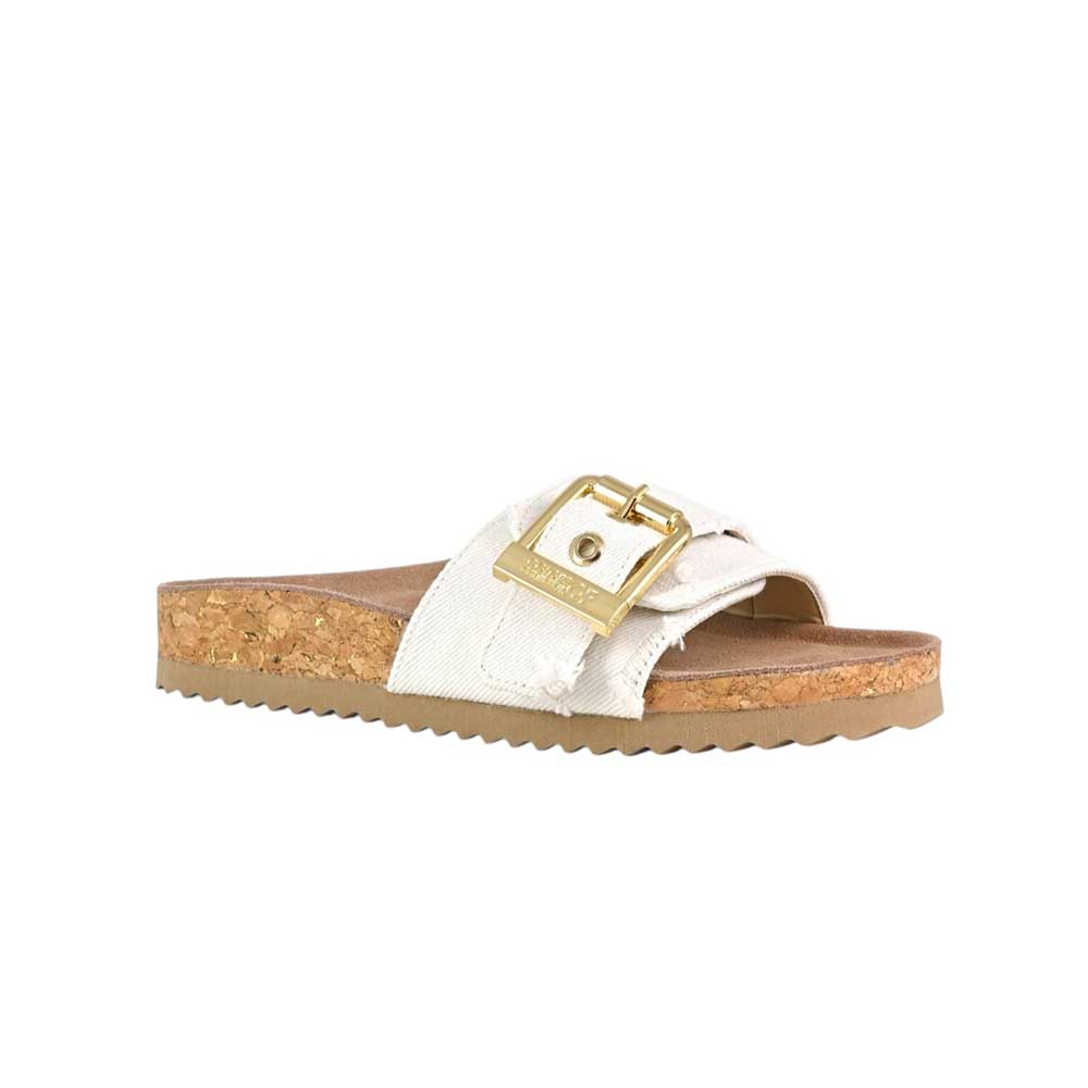 Sandalo monofascia in denim e sughero. Linee essenziali per il sandalo monofascia con fibbia logata perfettamente in tono con il tessuto in denim. Un accessorio davvero versatile, perfetto per chi ha uno stile poliedrico, che spazia dai look più casual a quelli più ricercati. Questo modello sa essere un valido alleato per le calde mattine in città o per le fresche serate al mare. Da abbinare ad abiti leggeri e colorati, pantaloni cargo e completi più sportivi.