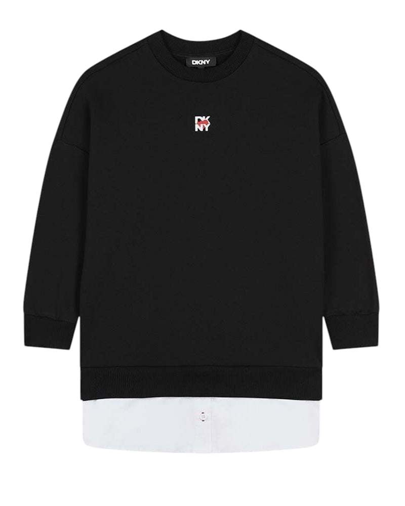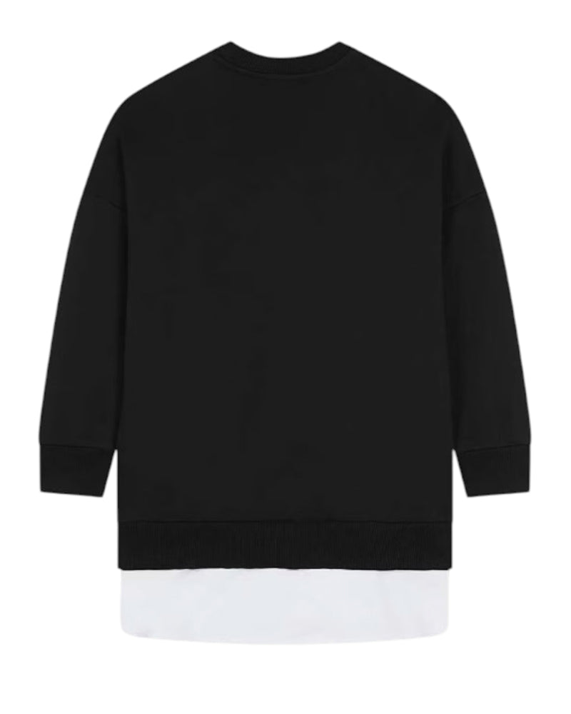 Abito nero da bambina realizzato in felpa di cotone sgarzato. Presenta collo tondo, spalle scese, maniche lunghe, finiture a coste. È decorato con patch logo in silicone applicata sulla parte anteriore.