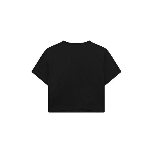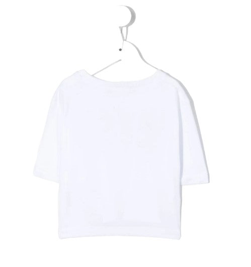 Kurzärmliges T-Shirt mit Rundhalsausschnitt, verkürztes Modell. Logo und Druck auf der Vorderseite.