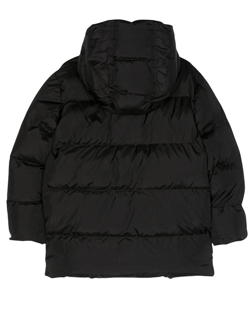 Steppjacke mit fester Kapuze, aufgedrucktem Logo auf der Vorderseite, verdecktem Frontverschluss und zwei Leistentaschen.