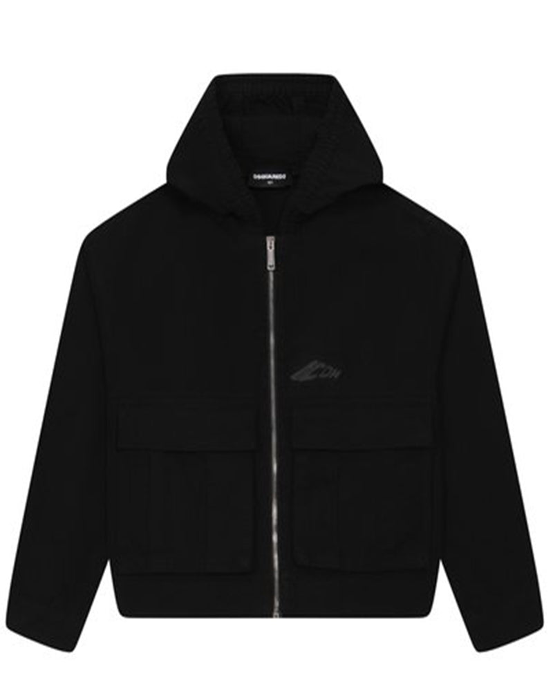 Giubbino nero con cappuccio da bambino realizzato in cotone ripstop. Presenta chiusura frontale con zip, maniche lunghe, due tasche con patta applicate sul davanti e orlo elasticizzato. È decorato con stampa logo sulla parte anteriore.