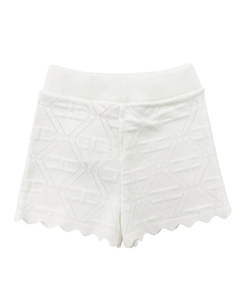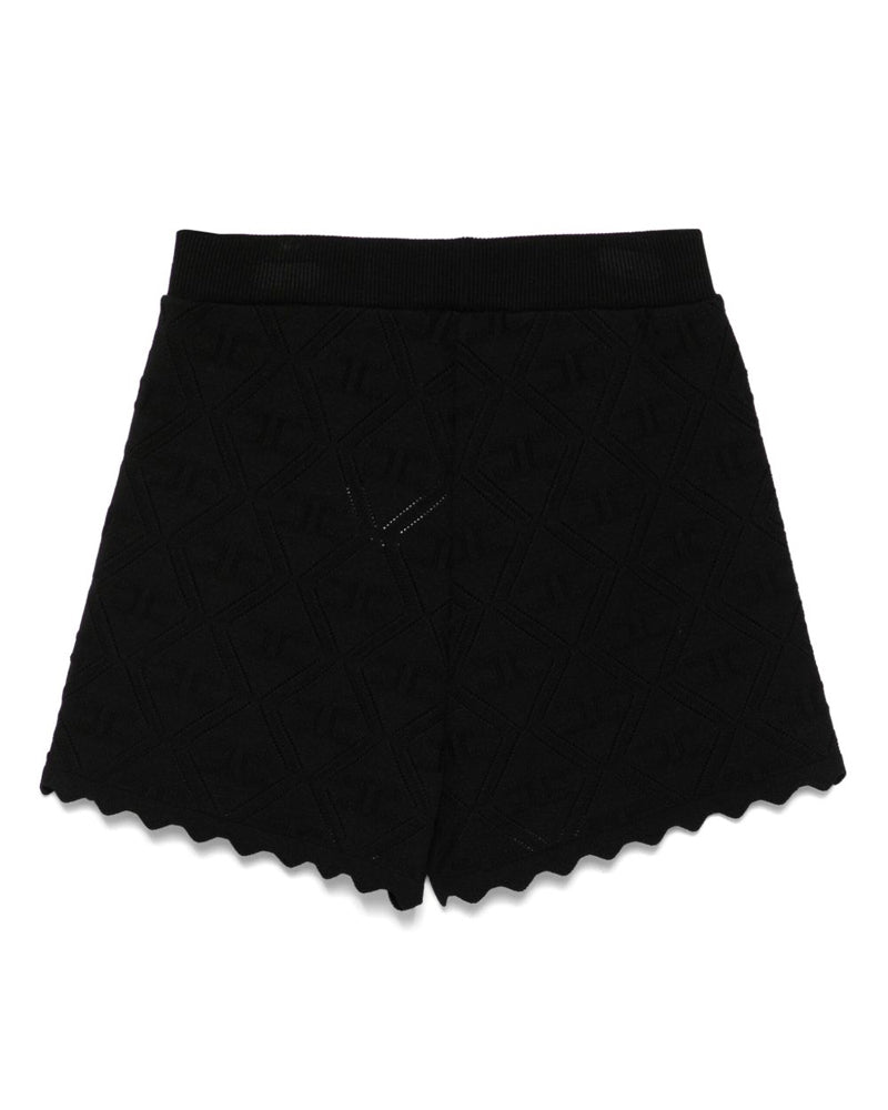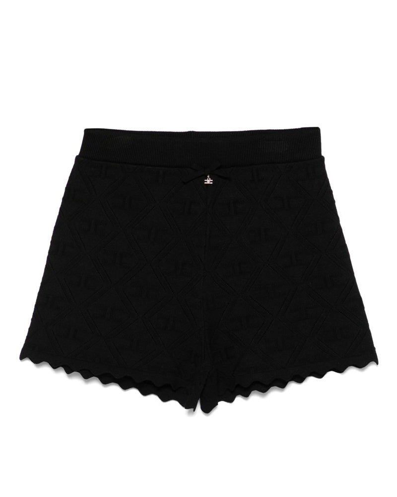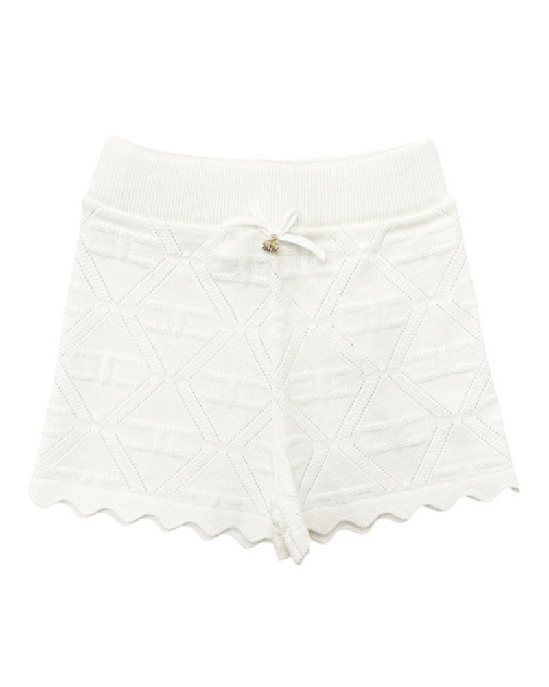 Shorts realizzati in tessuto traforato con motivo logo all-over, vita elasticizzata a costine e orlo smerlato. Sono decorati con fiocco e ciondolo logato sulla parte anteriore.