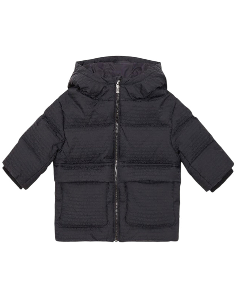 Giubbino imbottito blu da neonato, realizzato in nylon semilucido. Presenta design trapuntato, cappuccio fisso, collo alto, chiusura frontale con zip, maniche lunghe con polsini a coste, due tasche con patta applicate sul davanti e orlo dritto. È decorato stampa logo all-over.