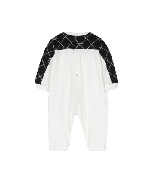 Allover-Logo-Stickerei, goldfarbene Knöpfe, Rundhalsausschnitt, Druckknopfverschluss hinten, zwei Brusttaschen mit Knöpfen und Druckknopf- und Reißverschluss vorne.