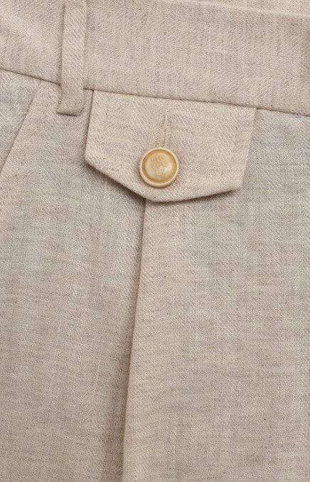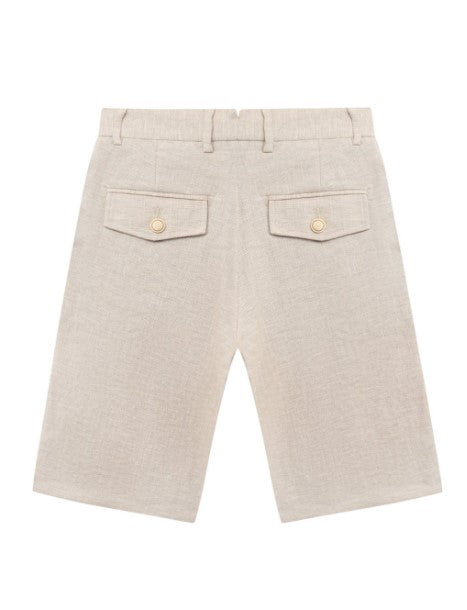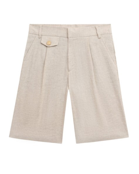 Leinen-Bermudashorts mit Falten vorne, schräger Tasche, Reißverschluss und Knopf vorne und Taschen hinten.