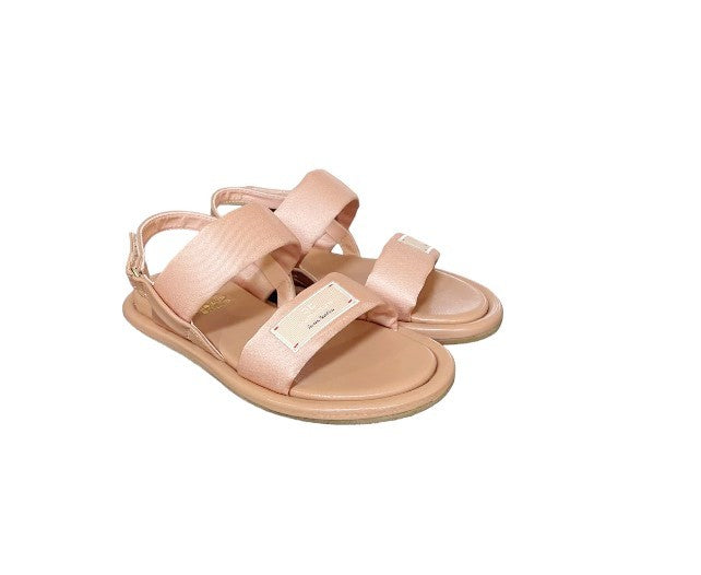 Antikrosa Satinbandsandale, Fersenverschluss mit Klettverschluss, Häkellogo auf der Vorderseite