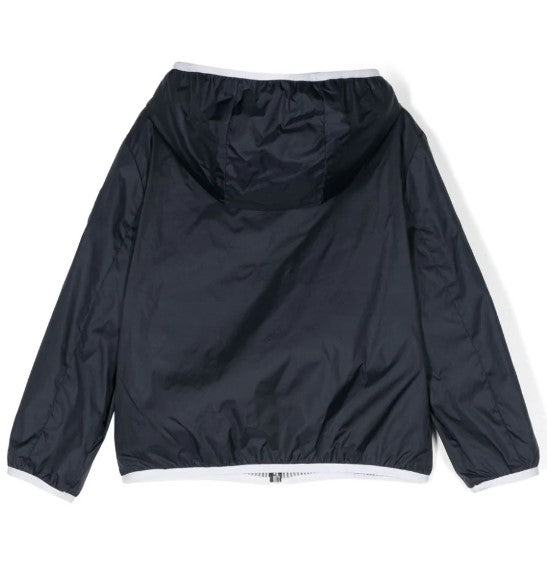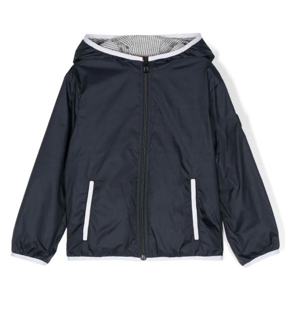Jacke mit Kapuze, Außenfutter aus synthetischem Material, kontrastierende Kanten, elastische Bündchen, gummierte Logo-Applikation am Ärmel, zwei seitliche Leistentaschen, Baumwollfutter, Seersucker-Textur am Futter, elastischer Saum, Reißverschluss vorne.