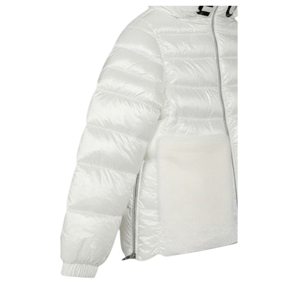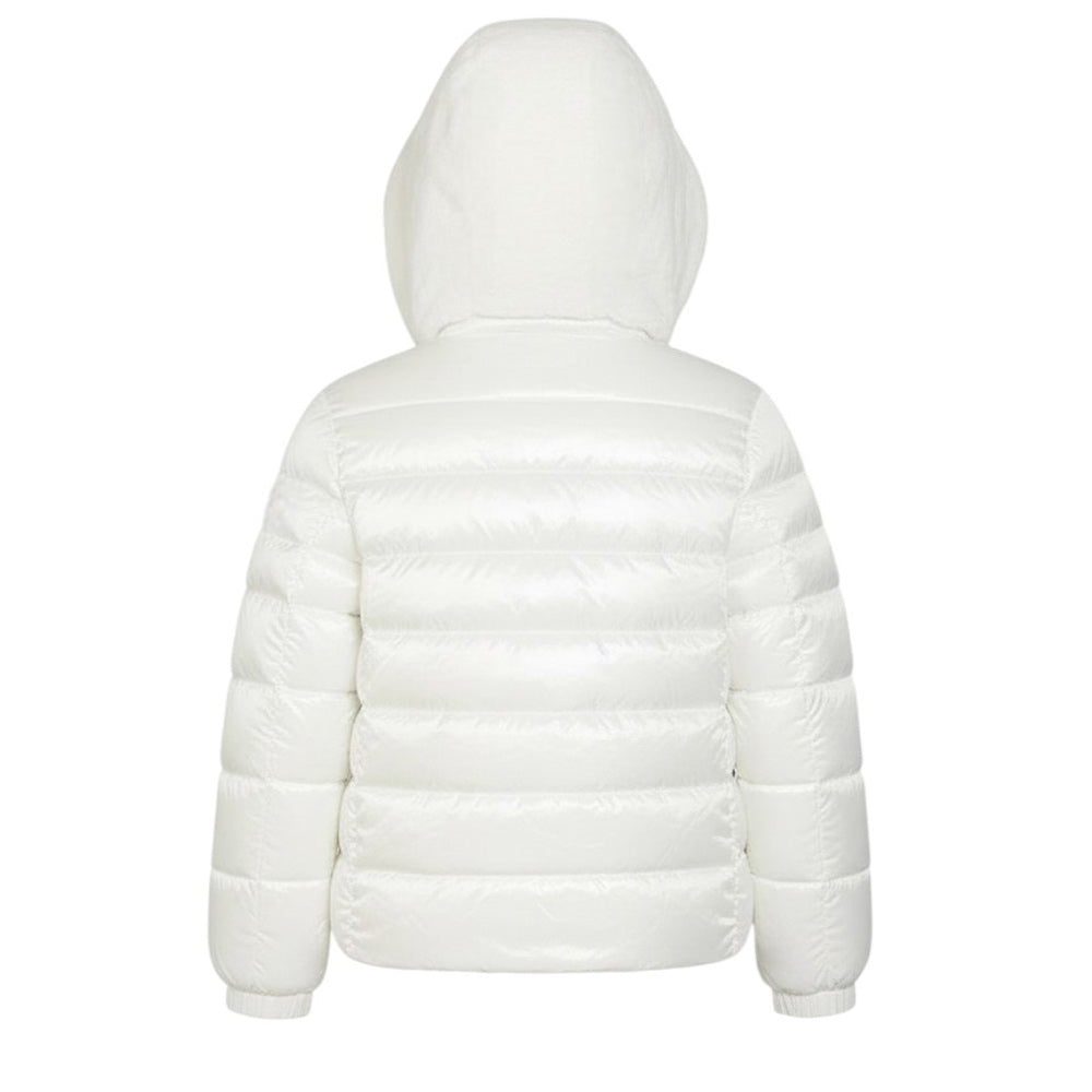 Giubbino imbottito bianco da bambina, realizzato in nylon semilucido. Presenta design trapuntato, cappuccio in eco-pelliccia rimovibile, collo alto, chiusura frontale con zip, maniche lunghe con polsi elasticizzati, due tasche in eco-pelliccia sul davanti e spacchi laterali con zip. È decorato con logo stampato a contrasto sul collo.