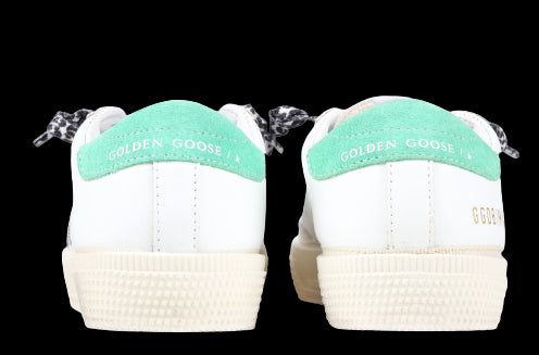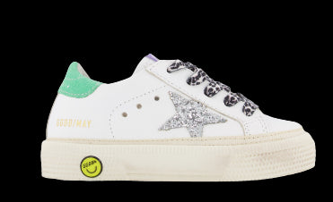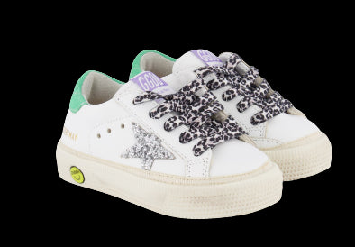 May-School-Sneaker mit gepunkteten Schnürsenkeln und glitzerndem Stern.